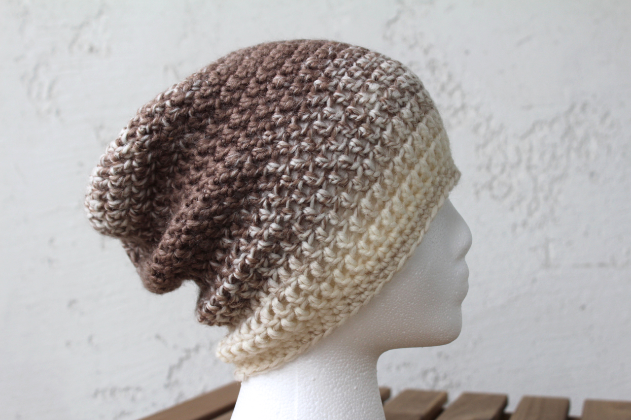 Shop update: Variegated cream and taupe crocheted unisex slouchy wool blend beanie