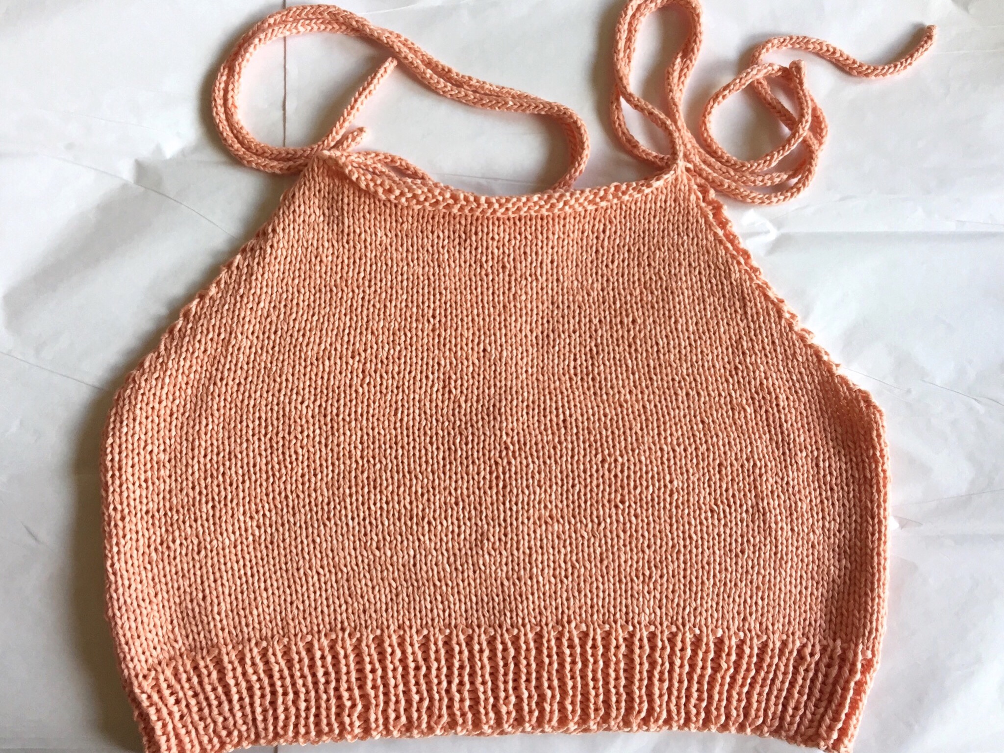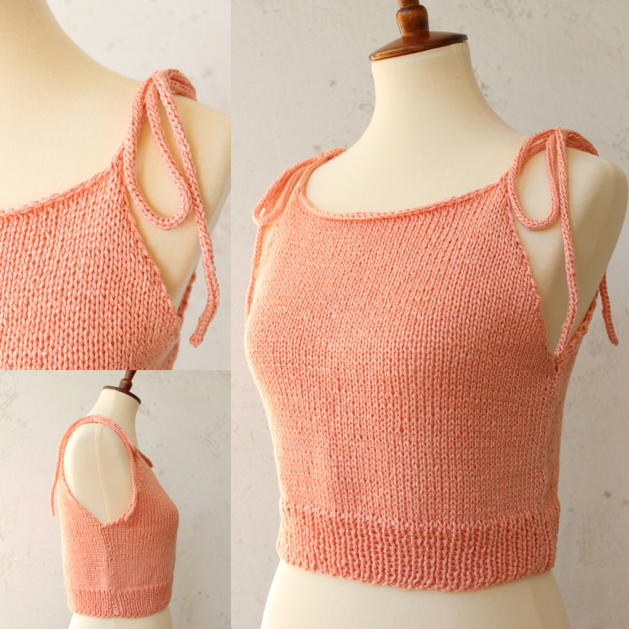 Hand knit peach Tencel cropped women’s shoulder-tie spring/summer camisole tank top.