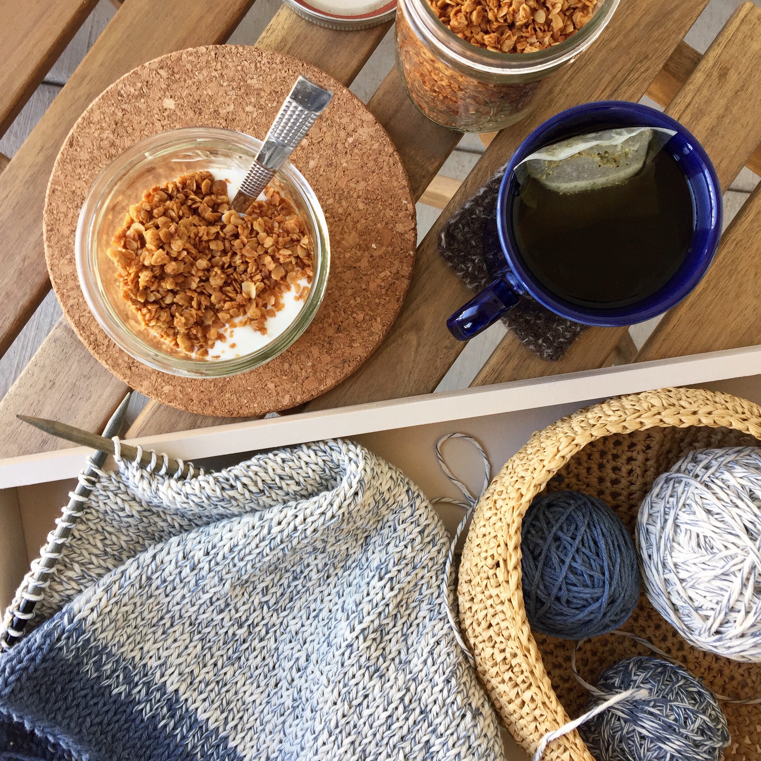I woke up this morning 1. determined to finish this knitted denim top so I can wear it out tonight and 2. CRAVING granola for some mysterious reason.