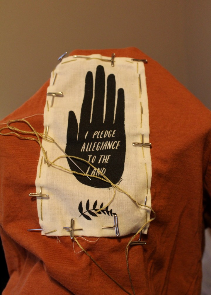 A beige fabric patch with a black screen print of a hand that says “I pledge allegiance to the land” pinned to a rust colored shirt in preparation for hand-sewing