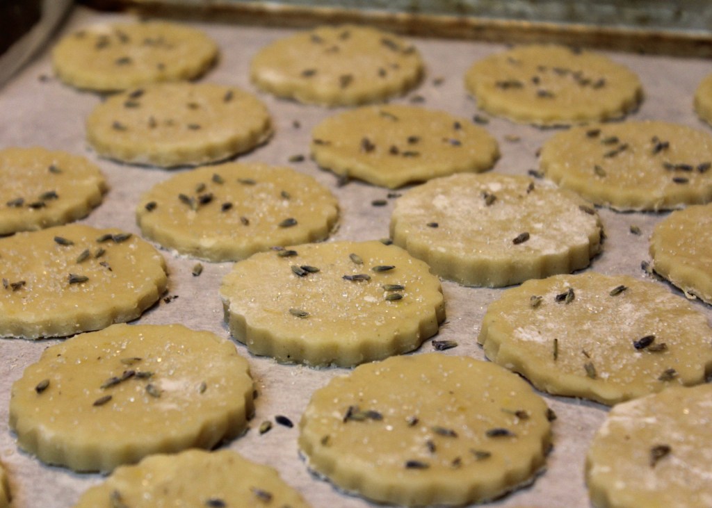 Working in batches of no more than 12 cookies at a time, transfer chilled, unbaked cookies to a room temperature baking sheet lined with parchment paper. Top each cookie carefully with a few whole lavender buds for color and a small sprinkling of granulated sugar. Proceed to bake for 8-12 minutes, until the bottoms are just starting to turn a light golden brown – visible when the edge of the parchment paper is gently lifted up from the baking sheet for a quick peek.