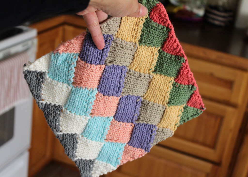 The pattern I used was Entrelac Knit Dishcloth (available as a free download via Yarninspirations) however instead of using the recommended Lily Sugar’n Cream Scrub Off which is a self-striping yarn, I switched to a new ball of Lily Sugar’n Cream cotton yarn between entrelac stripes.