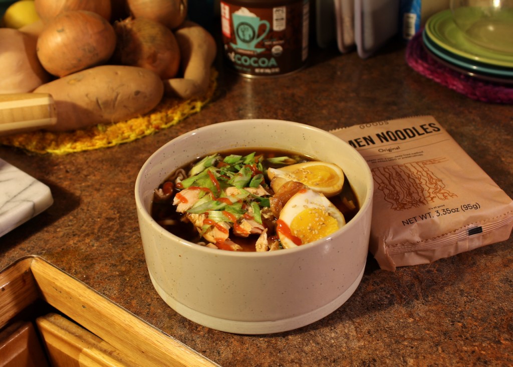 Through the lean times and the abundant, I have always eaten ramen. I’ve had the pleasure of eating legitimate ramen many times and as a result, I’ve refined my home ramen making techniques to meet my heightened expectations. In a pinch, instant ramen noodles can be quickly finessed and improved with the addition of a few seasonings–in this case substituting the provided seasonings completely–and various prepared toppings.